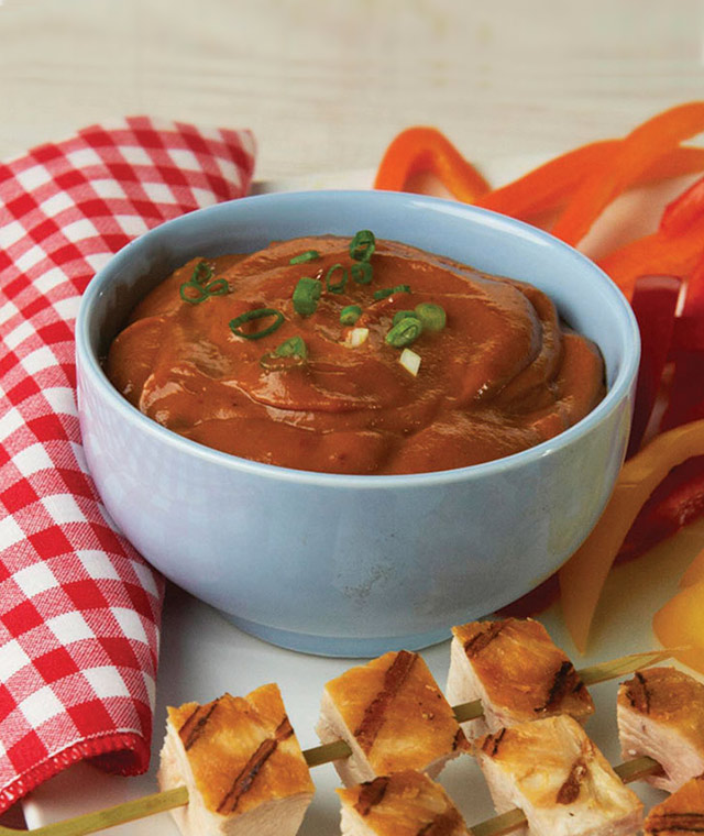在1夸脱(1.14升)的平底汤锅中放入所有的原料。中火烧至沸腾,持续搅拌。将火调小至微沸,经常搅拌,持续一分钟。如果想要装饰的话,可以放上剁碎的绿洋葱。最后做成一罐蘸酱,用来蘸你最喜欢的肉或者蔬菜。