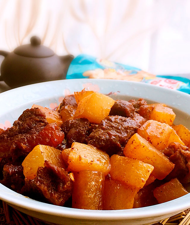 1.牛肉洗净切块泡出血水2.加入各调料及少量水高压锅压20分钟3.萝卜去皮切块4.将牛肉和汤水,与萝卜块一起倒入炖锅5.大火烧开后转小火慢炖,加入四季宝®柔顺花生酱拌匀6.焖至萝卜软烂,汤汁快收干即可装盘